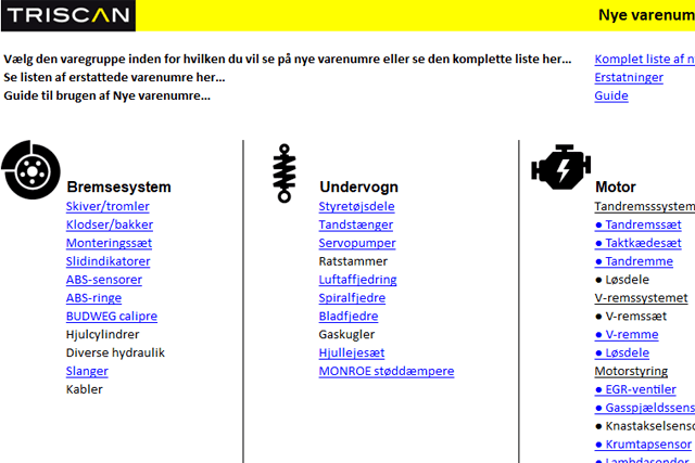 Vi har med det nye layout tilstræbt at gøre det nemt og hurtigt at finde information om nye varenumre, som er optaget i Triscans program. På startsiden er alle varegrupper, som har fået tilført nye varenumre, vist med blå understreget tekst. Herved får man hurtigt et overblik, og kan nemt fordybe sig i de varegrupper, som især har ens interessere.