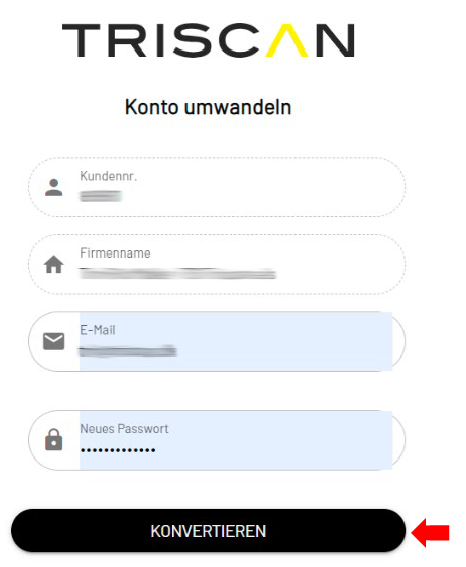 Geben Sie Ihre E-Mail-Adresse und Ihr neues, von ihnen selbst bestimmtes, Passwort ein und klicken Sie auf "Konvertieren". Das Password muss 8-stellig sein, Groß- und Kleinschreibung, sowie mindestens eine Zahl und ein Sonderzeichen enthalten.