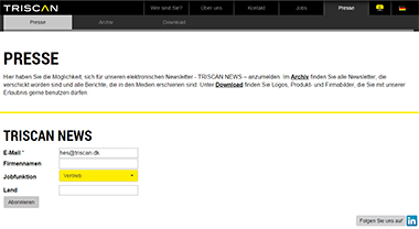 Möchten Sie stattdessen laufend durch unseren elektronischen Newsletter TRISCAN NEWS über die neuesten Entwicklungen informiert werden, haben Sie unter dem Menüpunkt „Presse“ die Möglichkeit, den Newsletter zu abonnieren. Hier können Sie außerdem ins Archiv gehen und erhalten dort Zugang zu sämtlichen News, in chronologischer Reihenfolge und nach Jahrgang sortiert.