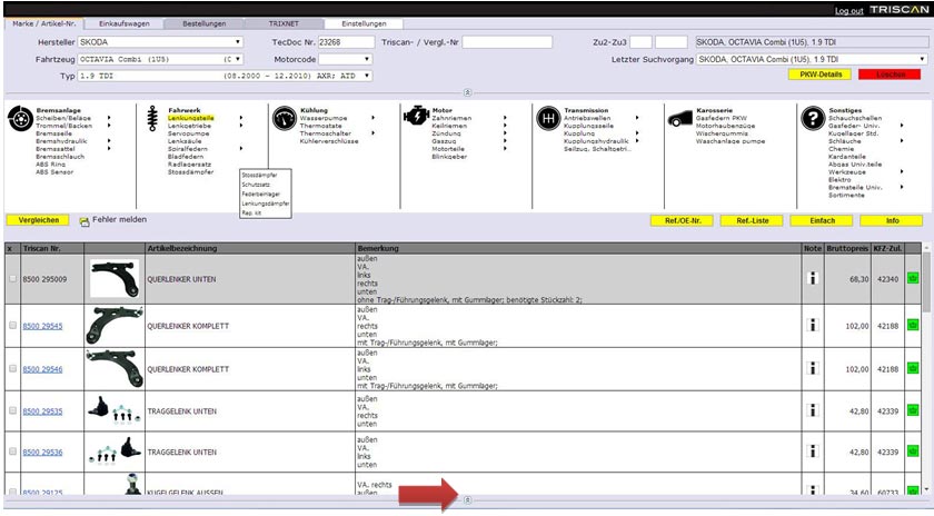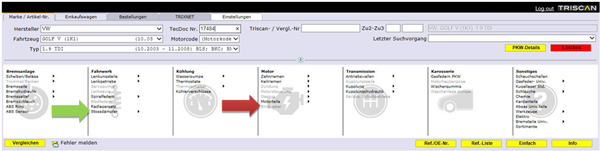 Im neuen TriWeb ist es einfacher geworden sich einen Überblick von den Produktgruppen zu verschaffen wo Triscan für ein ausgewähltes Automodell Ersatzteile anbietet. Nur bei Produktgruppen die mit schwartzer Schrift angezeigt werden (grüner Pfeil) gibt es Ersatzteile für das ausgewählte Automodell. Produktgruppen, in denen es keine Ersatzteile gibt werden mit einem grau schattierten Farben (roter Pfeil) gezeigt.
