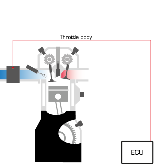 Electronically controlled throttle bodies work as follows: The ECU detects the accelerator’s position and gives a message to the throttle body to open the valve. A throttle position sensor communicates the position of the valve to the ECU. The airflow meter recognizes the increased volume of air and gives a message to the injection system to inject more fuel. Throttle bodies may also contain valves and adjustments to control the minimum airflow during idle.There is often a question of an electrically controlled (selenoid) valve IACV (Idle Air Control Valve) that the ECU uses to control the amount of air that can bypass the main throttle opening to allow the engine to idle when the throttle is closed.