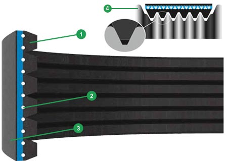 1: Specielt EPDM fibermateriale - giver forlænget holdbarhed og modstår højere belastning 2: Polyestertråd - særdeles stabilt materiale ved høj belastning 3: Slidstærkt væv fremstillet af EPDM materiale, der giver høj fleksibilitet 4: Optimal remprofil på 42 grader giver en perfekt pasning på både nye remskiver og remskiver som allerede har været i drift