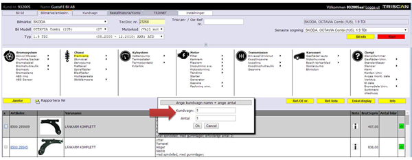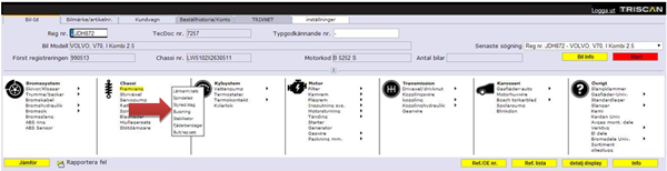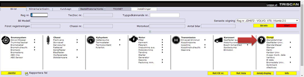 Äntligen en sökning på både Reg.nr. och bilmärke/artikelnummer visas varugrupper inom vilka det finns delar till den valda bilmodell med svart tektst (grön pil). Kategorier i vilka det inte finns några delar till bilen visar en skuggad grå färg (röd pil).