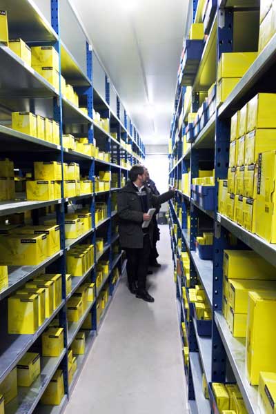 Vi besökte Hamm/Sieg, där Hirsch just har avslutat byggandet av ett modernt logistikcenter. Florian Bargon, som är anställd som lagermedarbetare, tog sig tid att visa oss runt på lagret. Naturligtvis var vi särskilt glada över de gula hyllorna (se nedan), där mer än 12.500 av Triscans varunummer är på lager, däribland framvagnsdelar, hjullager, sensorer såväl som en mängd wire.