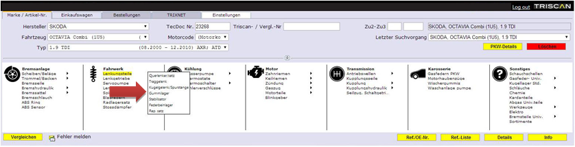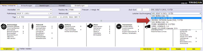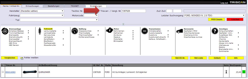 Die Felder Triscan Nr. und OE-/Refnr. sind zusammengeführt. Egal, ob Sie nach einer Triscan Artikelnummer, eine OE-Nummer oder einen Querverweis suchen, es kann alles in diesem Feld eingegeben werden.