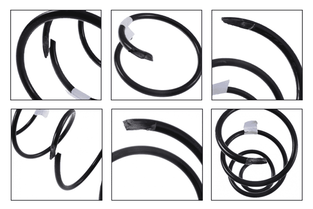 The second test was a durability test. During this cyclic test, the springs are continuously pressed together 1 million times or until the springs crack. In this case, 180 mm compression from a starting point of 875N-3833N. As can be seen from the table below, the springs cracked after approx. 95,000 and 612,000 compressions. The tests performed are done at 20 degrees and it is worth noting that the probability of coil spring cracking increases the lower the ambient temperature is. As with the first test, the inability of the springs to pass the test can be attributed to the use of low-quality spring steel.