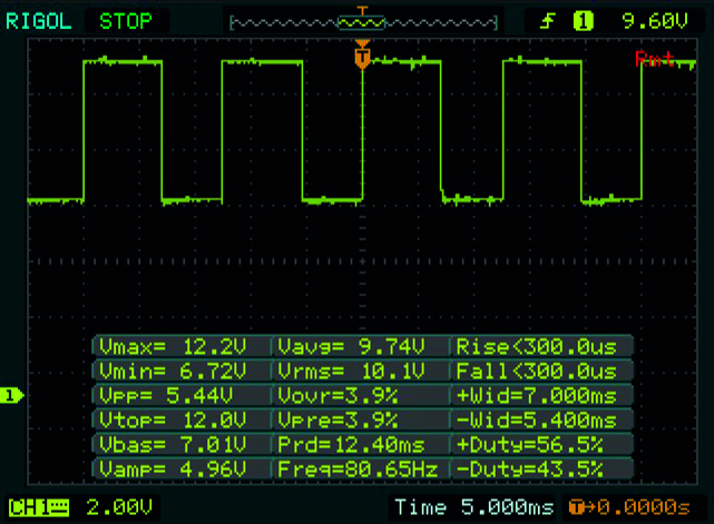 Här ses den rektangulära signalen från en antingen aktiv eller induktiv ABS-sensor (hall effect chip). Den aktiva arbetar med magnetisk ABS-ring och den induktiva med ABS-ring med tänder